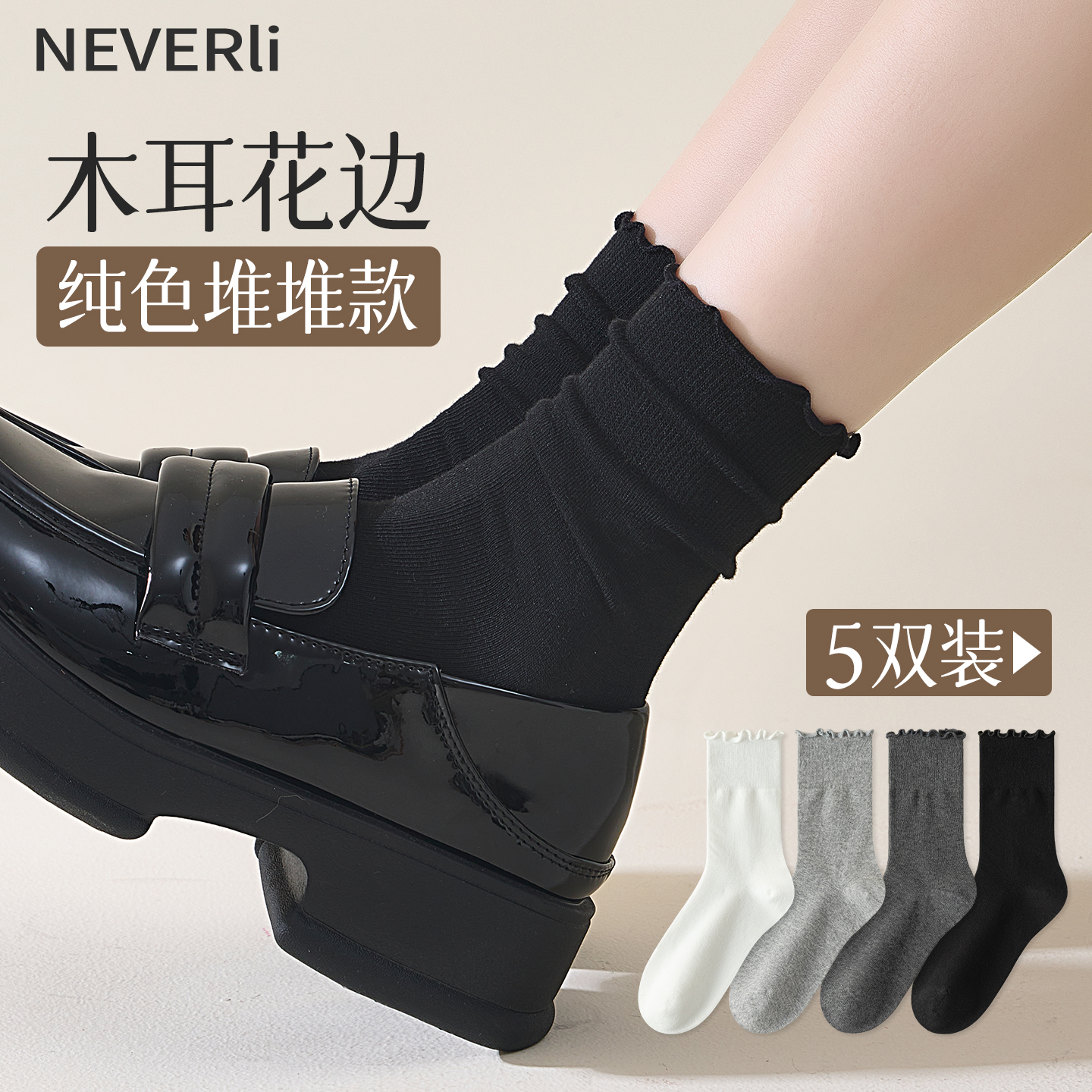 袜子女黑白春夏复古奶油系卷边中筒堆堆袜纯色简约月子袜ins潮风