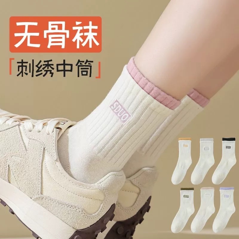 袜子女中筒袜潮百搭日系堆堆袜女士字母袜子防滑黑白抗菌灰色刺绣