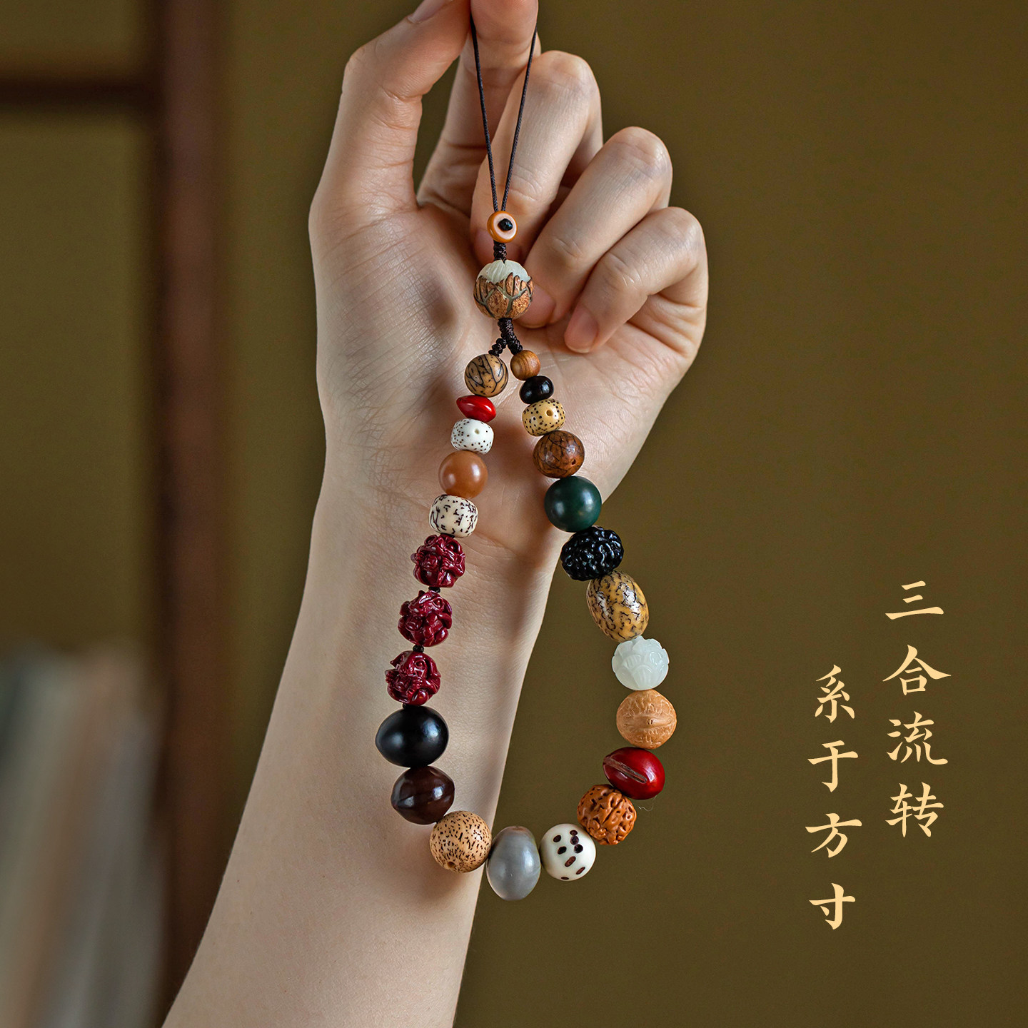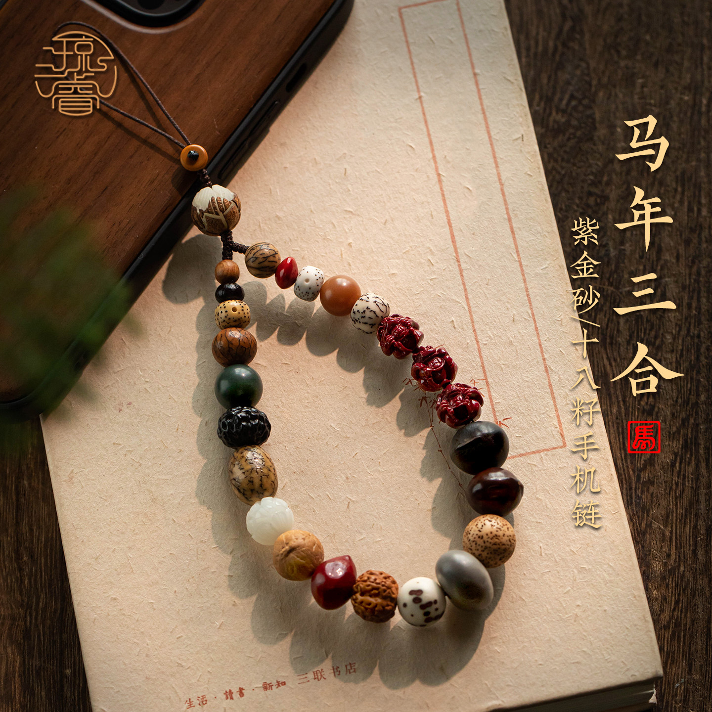琼睿保真朱砂三合手机链十八籽菩提木珠本命年手机挂绳木质多宝转运生肖挂件紫金砂佛珠手腕编织带新年礼物