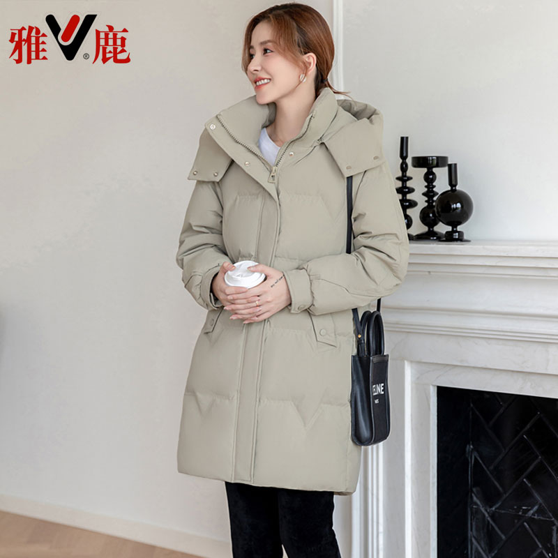 雅鹿2025新款中长款羽绒服女韩版宽松防风加厚白鸭绒冬季连帽外套