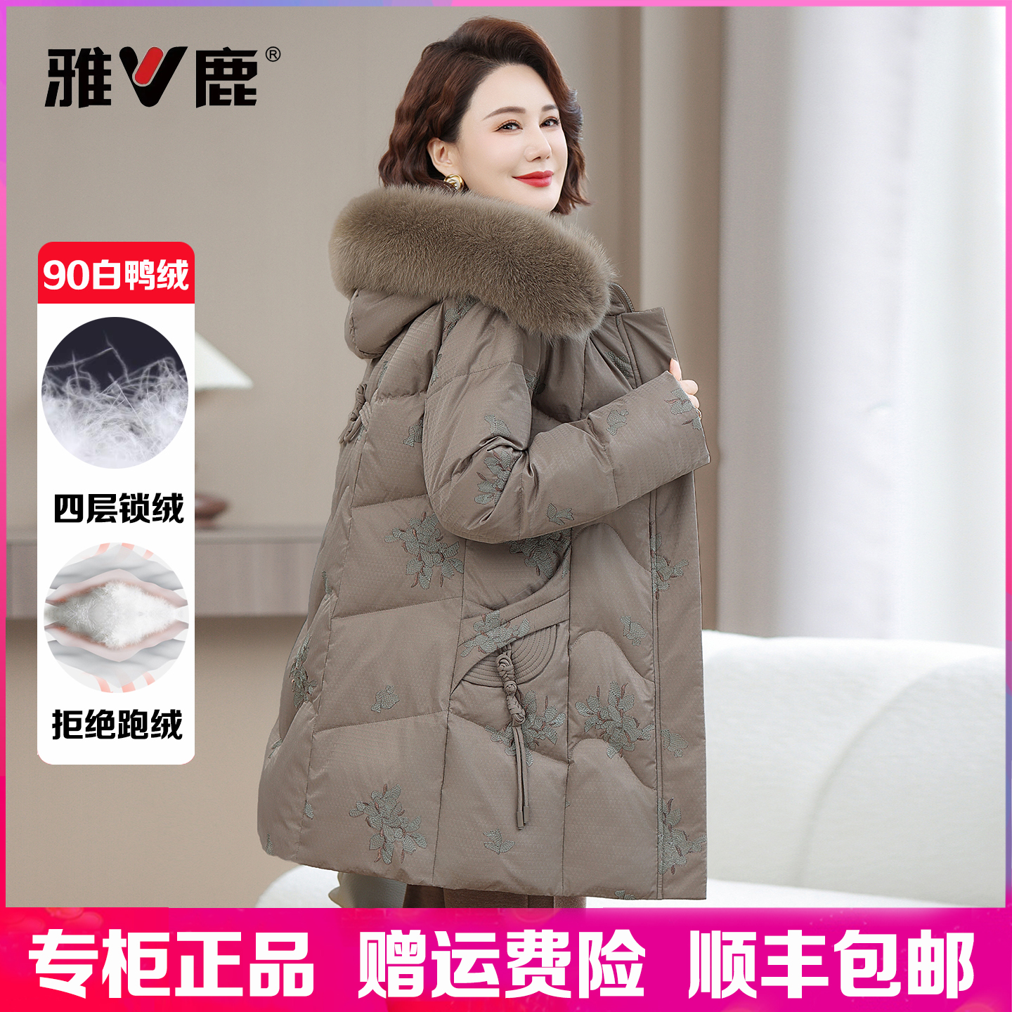 雅鹿羽绒服女中长款2025冬季新款中老年妈妈连帽刺绣休闲保暖外套