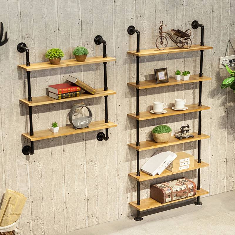复古水管置物架墙上铁艺壁挂书架多层实木置物架工业风管道展示架