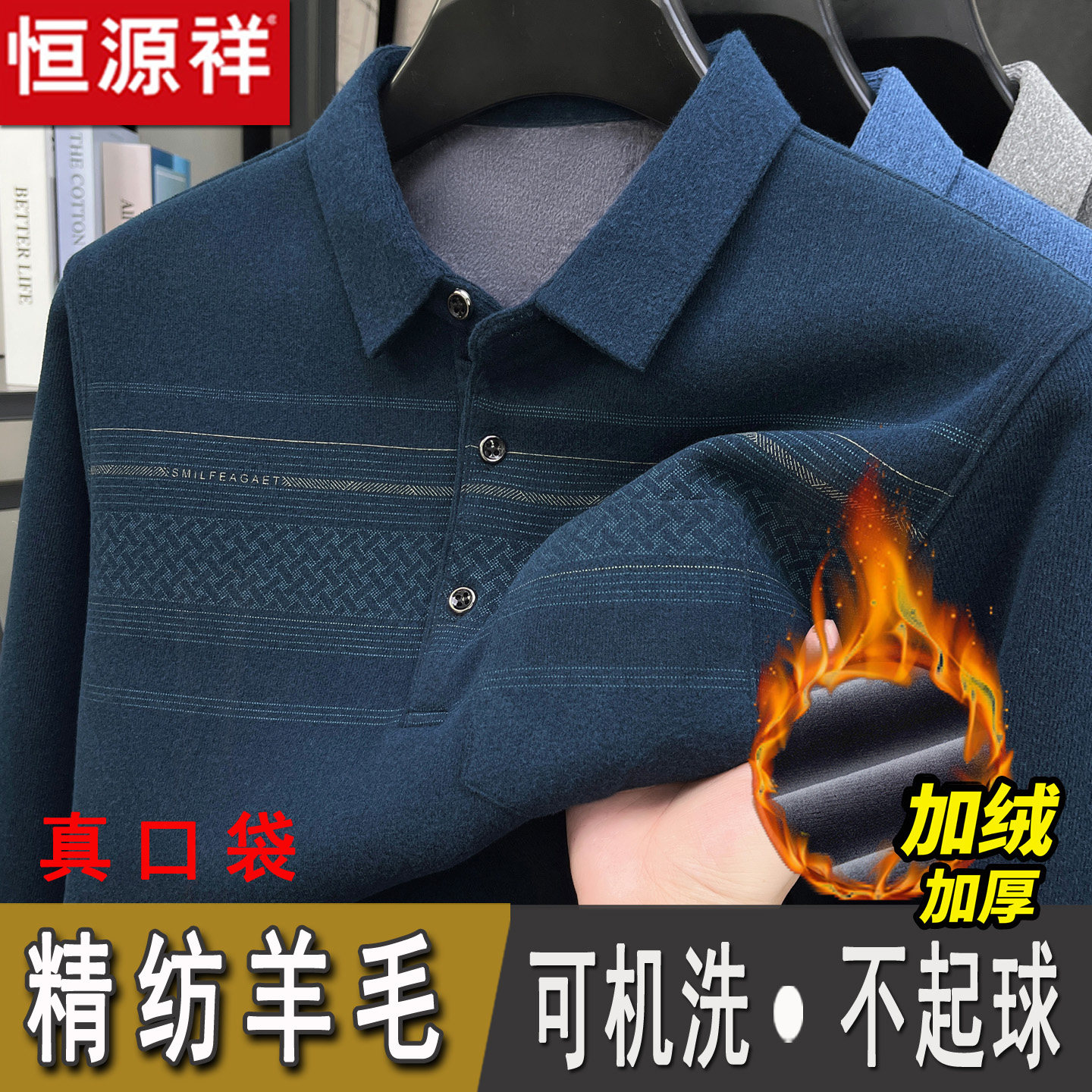 恒源祥羊毛衫男2025新款中老年衬衫领爸爸装加绒加厚羊绒打底毛衣