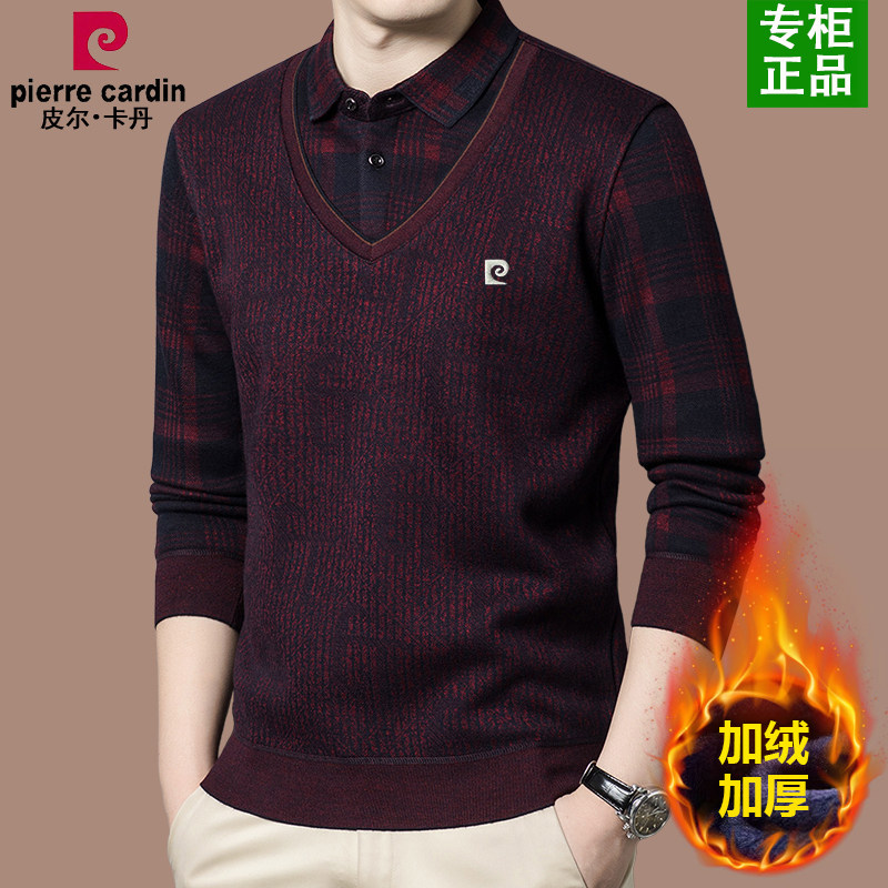 皮尔卡丹纯羊绒假两件毛衣男中老年衬衫领加绒加厚爸爸装保暖上衣