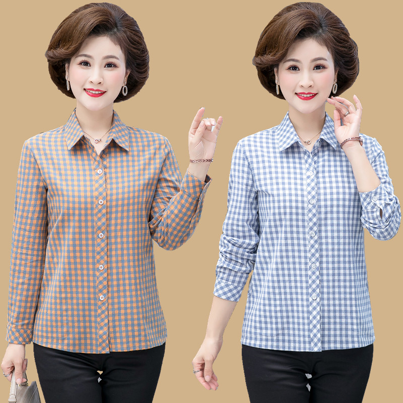 妈妈纯棉衬衫女长袖全棉春秋装中老年婆婆上衣格子衬衣女宽松大码