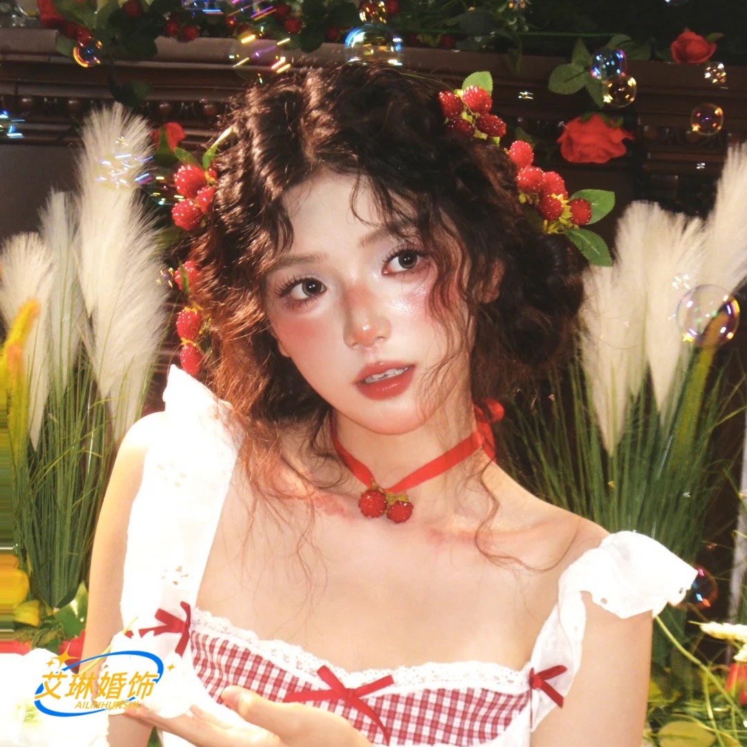 韩式油画风新娘头饰红色树莓发簪个性森系婚纱摄影造型发饰配饰女