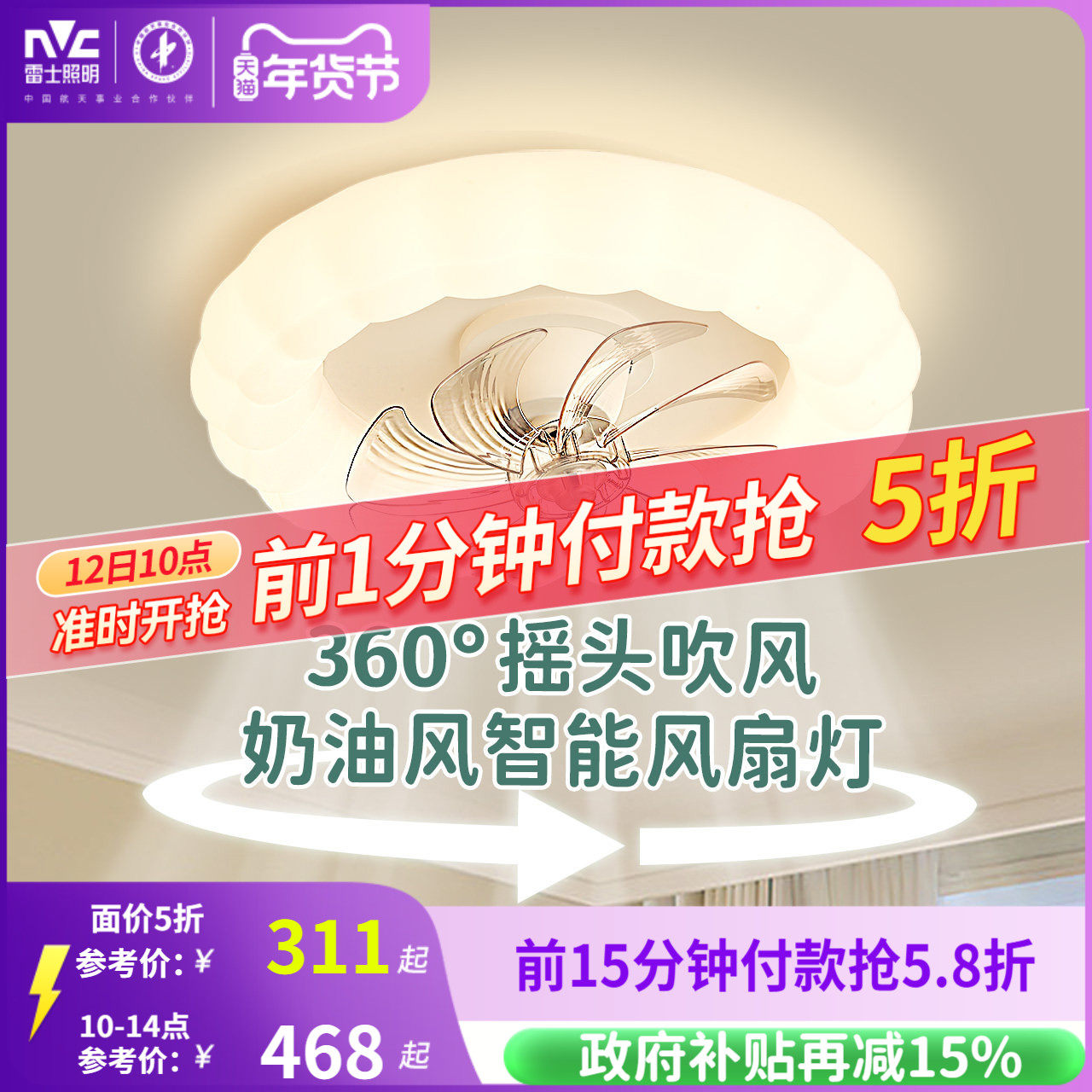 雷士照明摇头风扇灯吊灯奶油风主灯现代简约灯具卧室灯法式客厅灯