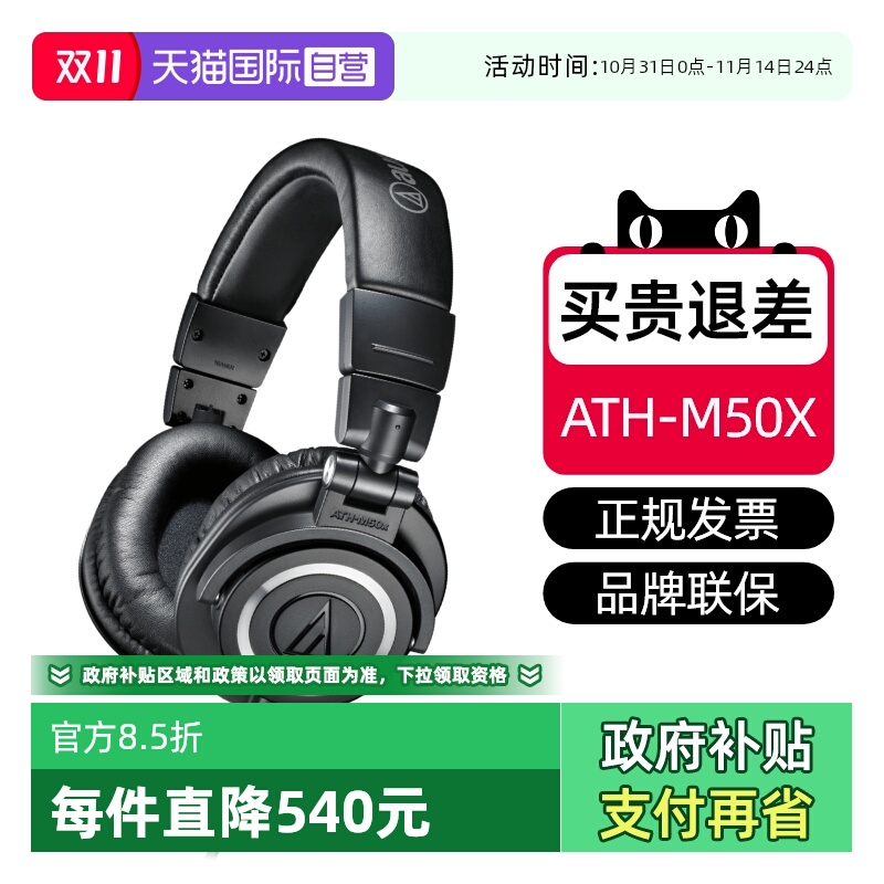 铁三角 ATH-M50x 专业头戴式监听耳机有线声卡耳返配音高保真HIFI
