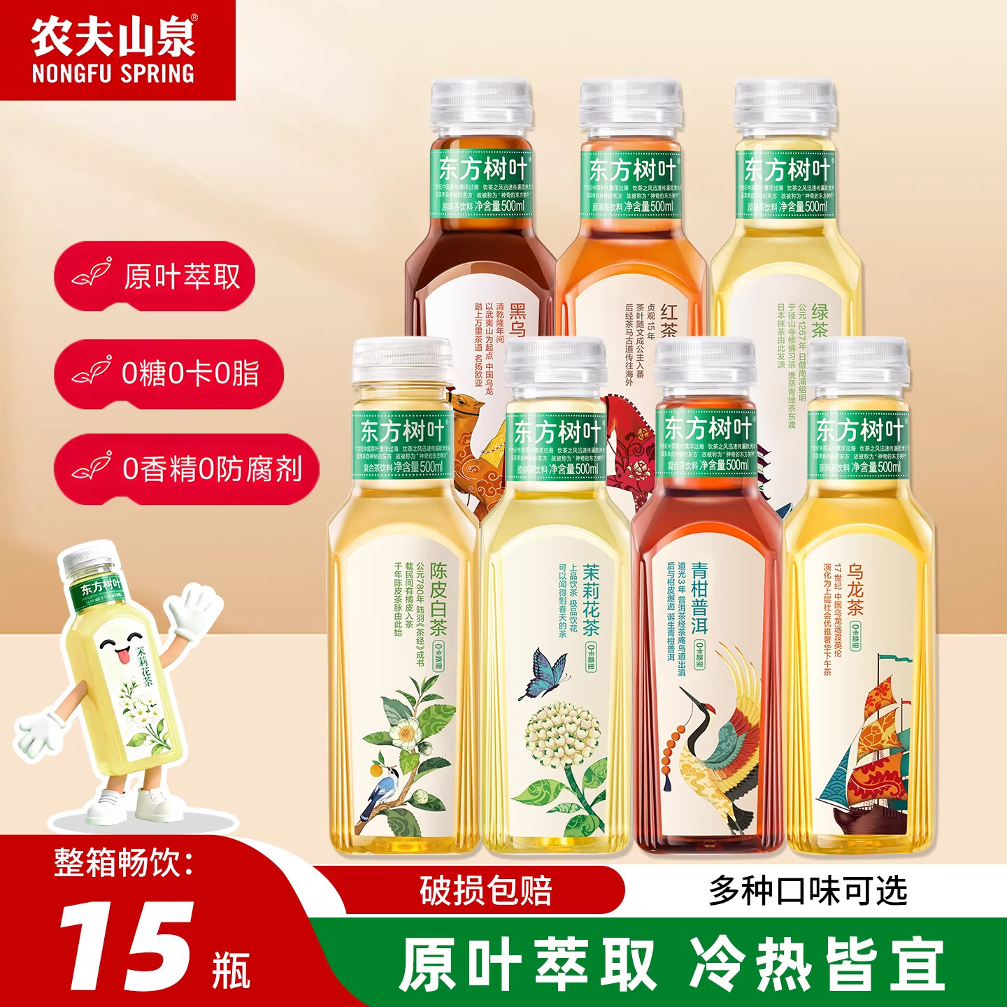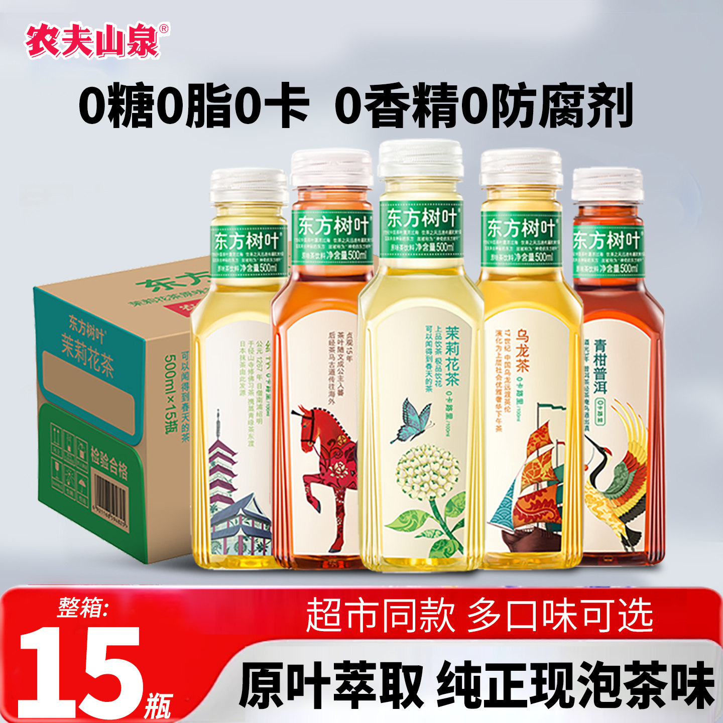 农夫山泉东方树叶无糖饮料500ml*15瓶茉莉花茶 绿茶红茶黑乌龙茶