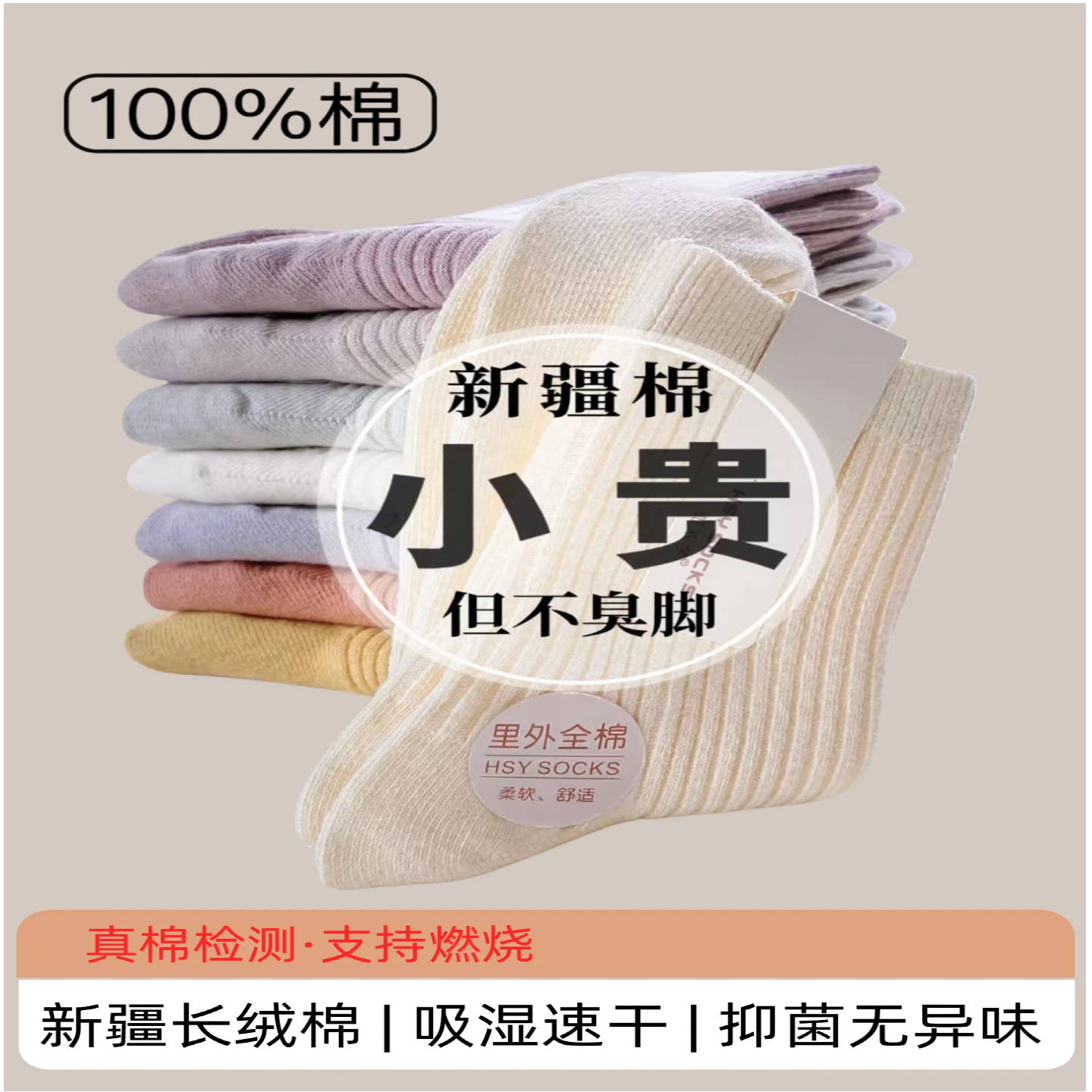 新疆棉100%纯棉袜子男女同款运动中筒四季纯色短筒防臭长袜ins潮