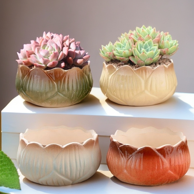 素烧陶瓷花盆粗陶透气多肉小花盆阳台桌面简约创意莲花摆件小植物