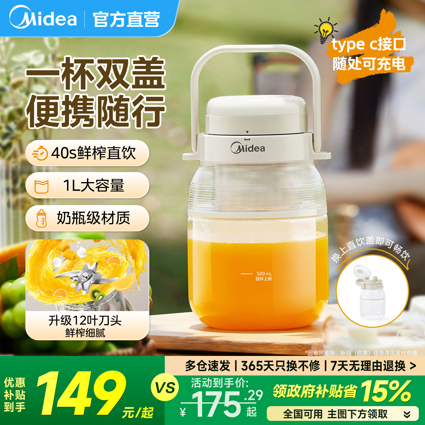 美的便携无线2025新款榨汁机家用大容量充电吨吨杯户外水果原汁机