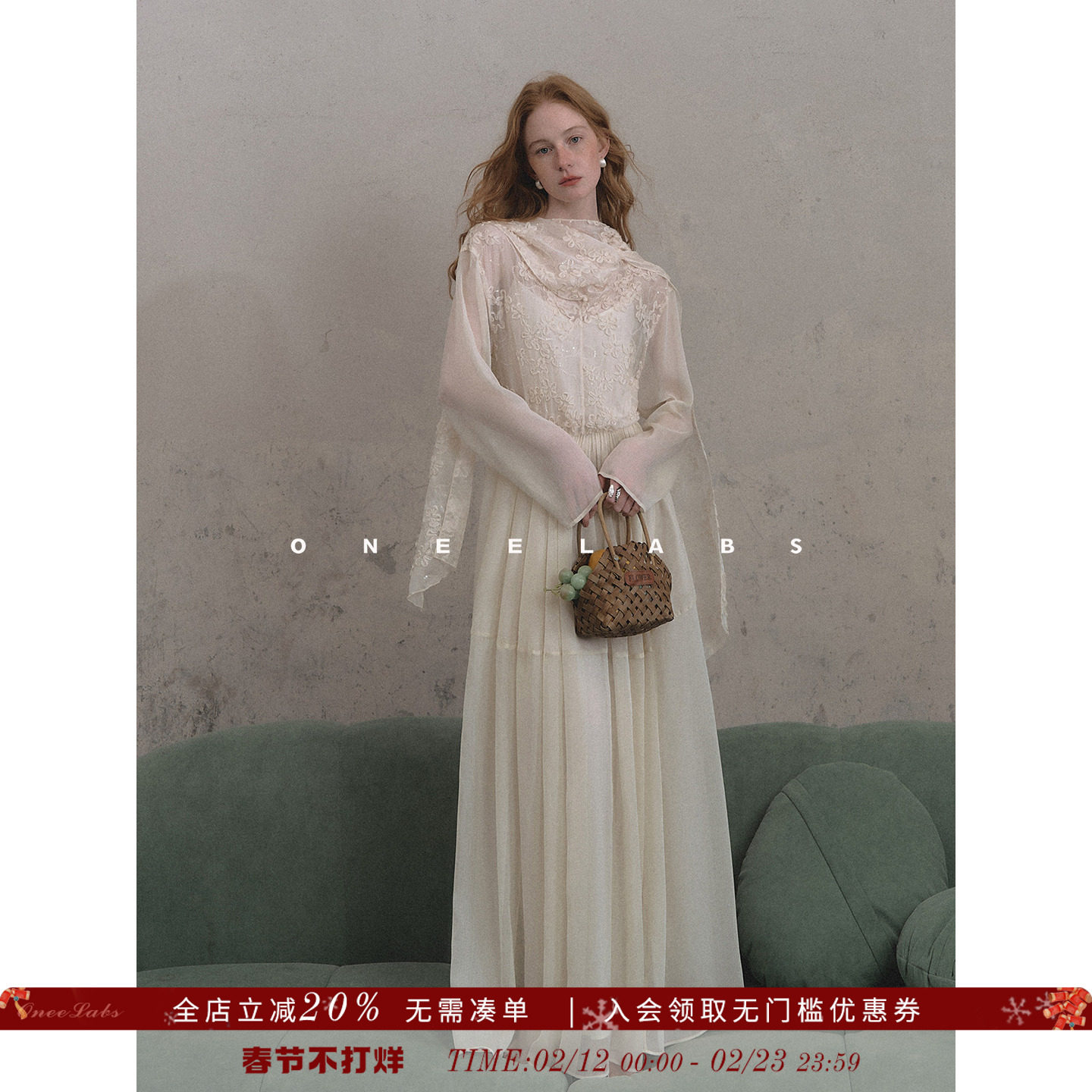 ONEELABS原创品牌 重工绣花亮片 双层裙摆 法式优雅飘带连衣裙女