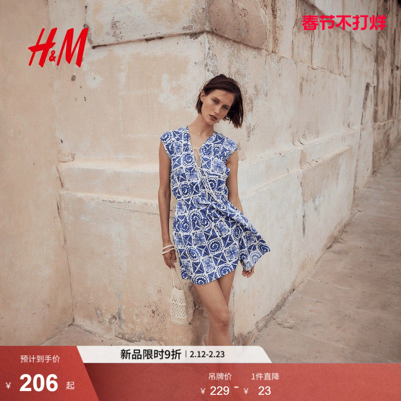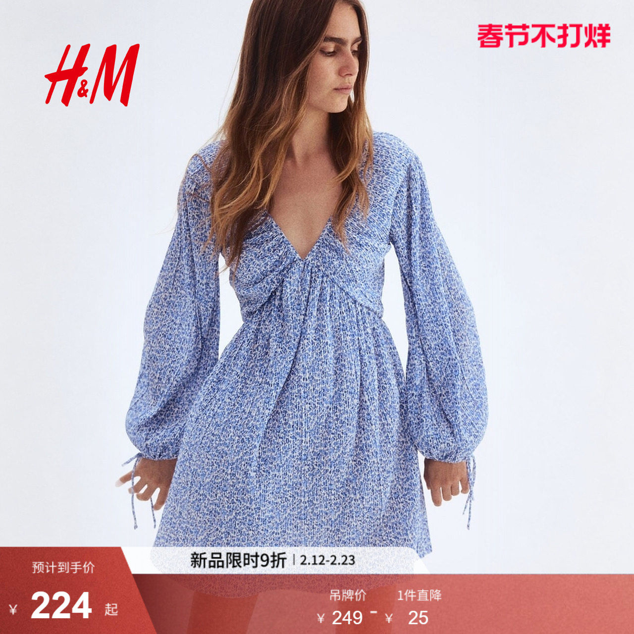HM女装连衣裙春季收腰V领抽绳装饰府绸设计感碎花裙1293958