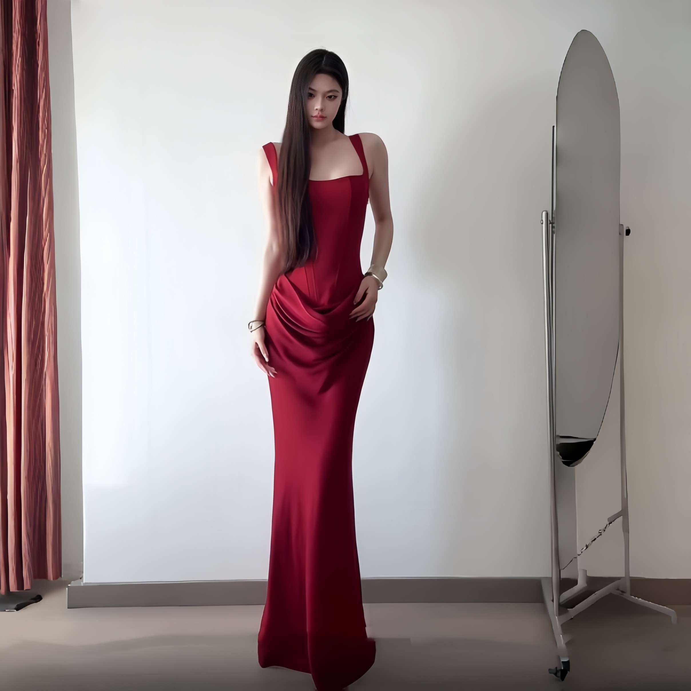 纯欲性感红色束腰吊带连衣裙女收腰鱼尾裙气质长裙高级缎面礼服裙