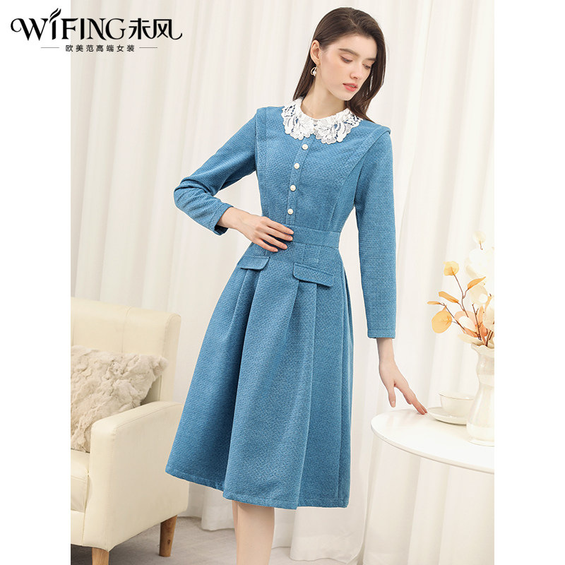 未风蓝色粗花呢连衣裙女冬2025冬季新款女装打底内搭显瘦长袖裙子
