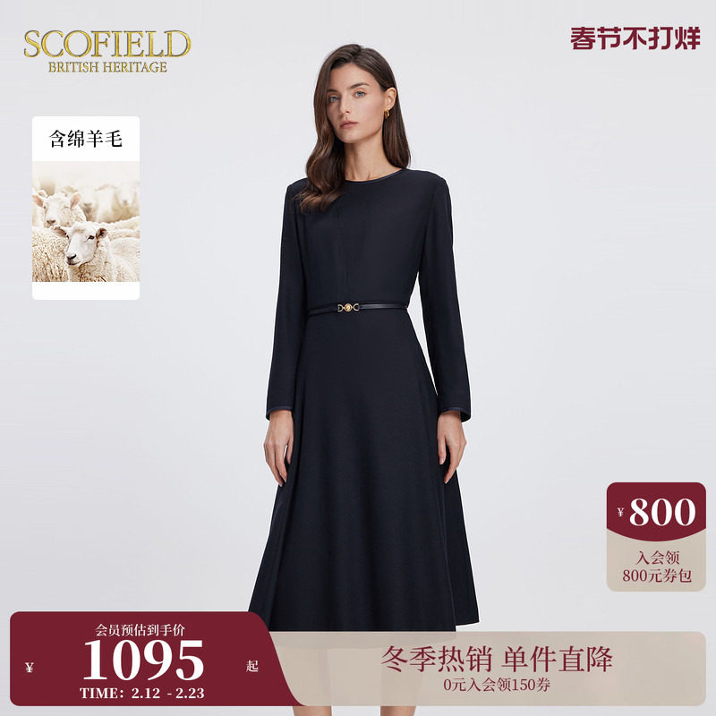【含羊毛】Scofield女装简约领口拼接A摆收腰连衣裙2025春季新品