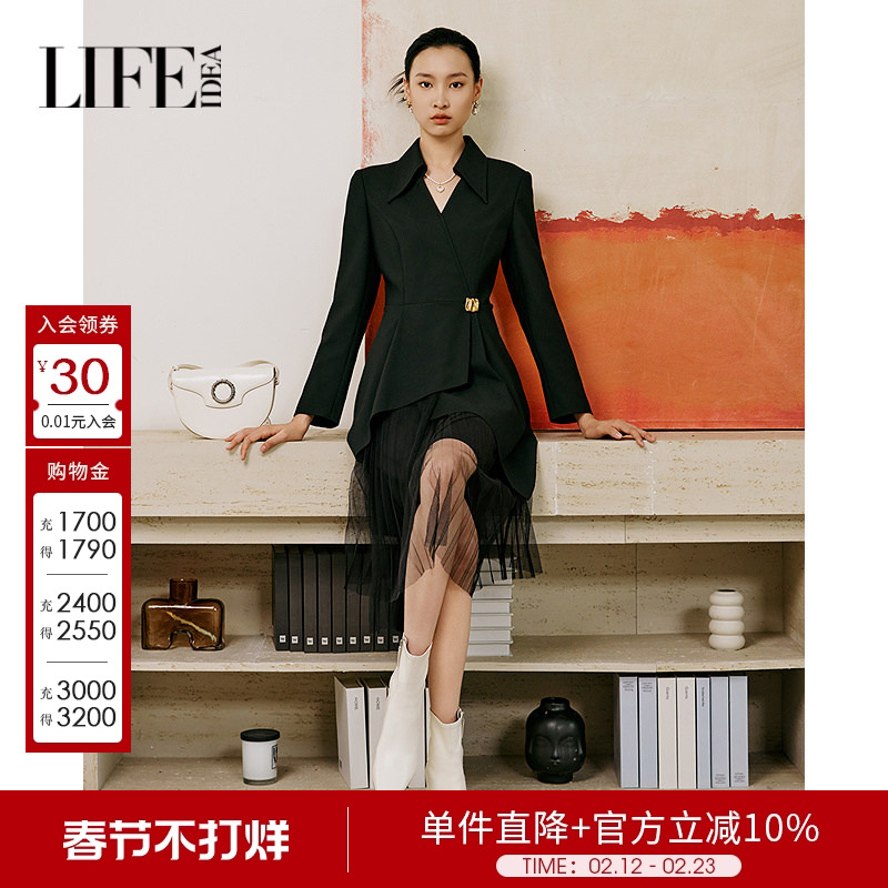 菲梦伊原创钉珠黑色西装连衣裙女秋季通勤褶皱设计感气质职业裙子