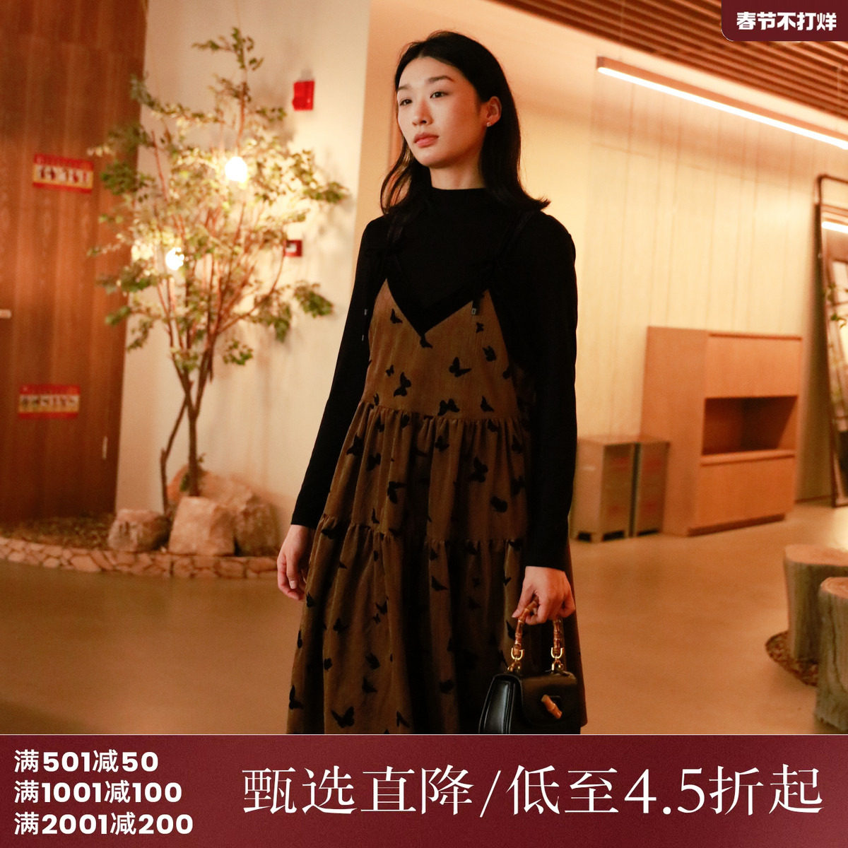 西町村屋吊带裙女冬季新款法式浪漫丝绒蝴蝶收腰连衣裙AD8404001