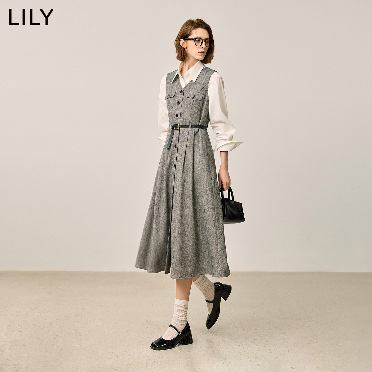 LILY2025冬新款女装格雷系复古无袖收腰V领气质通勤马甲式连衣裙