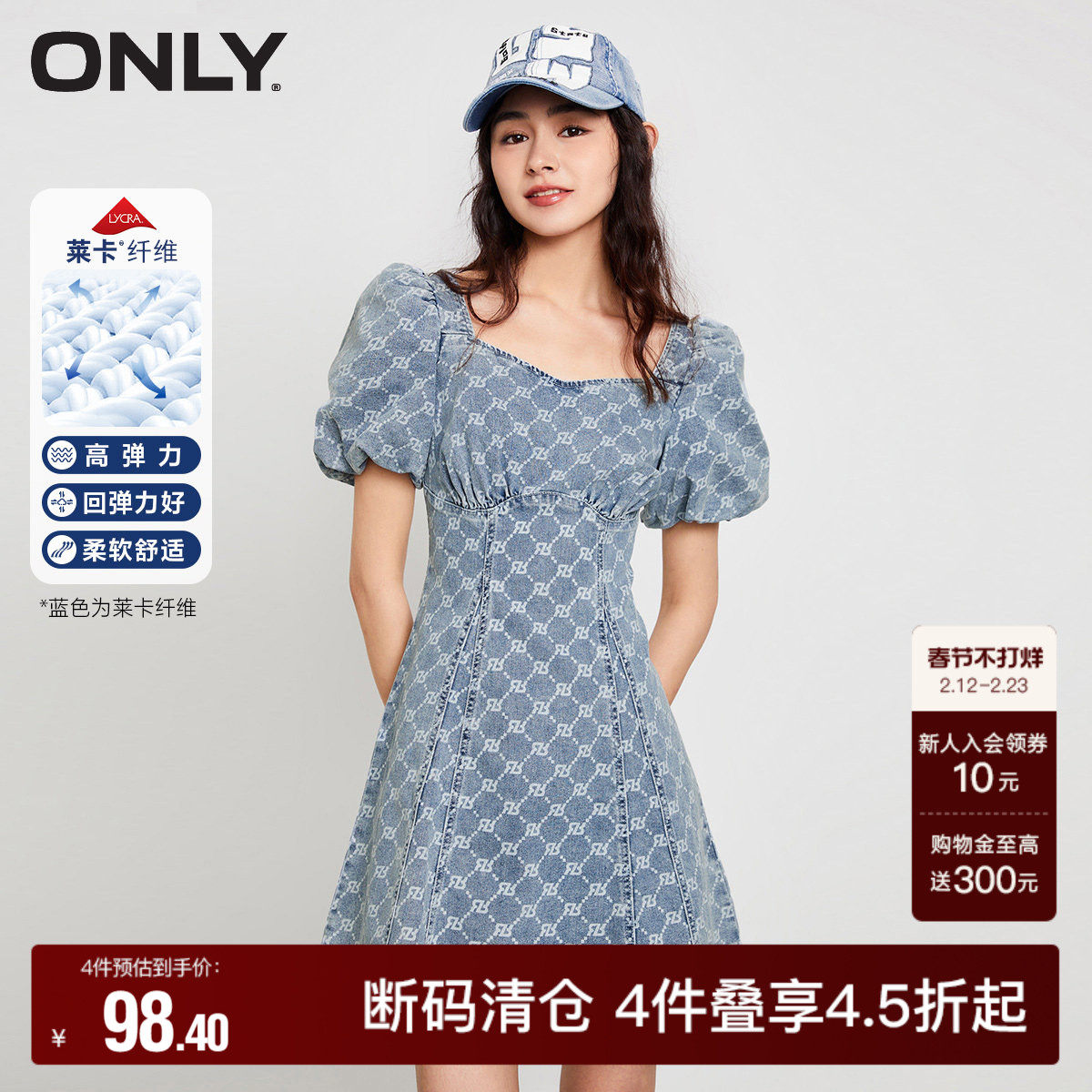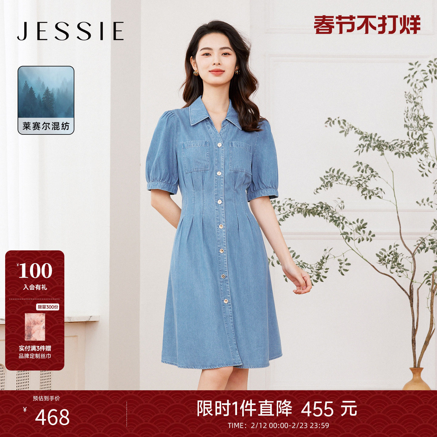 JESSIE复古牛仔连衣裙女士夏款气质通勤翻领收腰裙显瘦五分泡泡袖