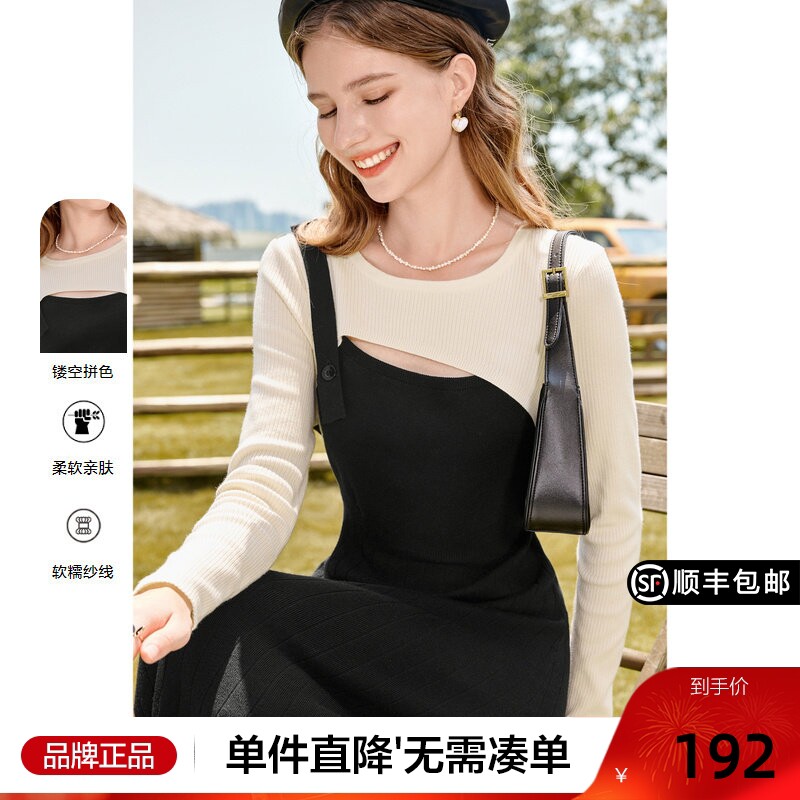 betu百图女装2025年秋季新款镂空气质收腰假两件针织毛衣连衣裙