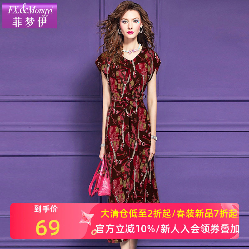 菲梦伊印花红色连衣裙女短袖夏季复古轻薄系带收腰大码中长款裙子