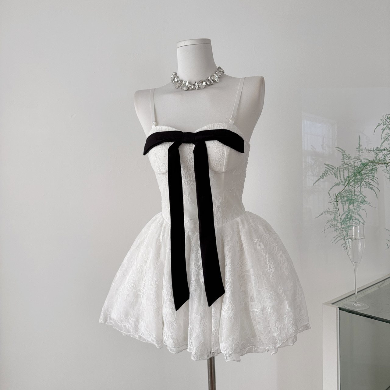 Sweet草莓初黛白巧法式纯欲风蝴蝶结收腰显瘦蕾丝重工女款连衣裙