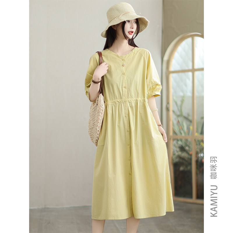 咖咪羽100%棉休闲女士百搭复古中长款气质收腰简约显瘦女款连衣裙