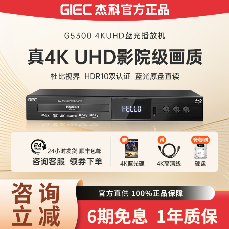 杰科G5300Plus真4K UHD蓝光播放机杜比视界dvd影碟机硬盘播放器CD
