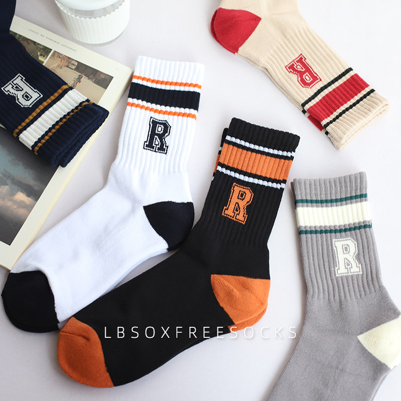 美式R字母滑板袜子男秋冬纯棉中筒袜毛巾底吸汗加厚保暖运动长袜