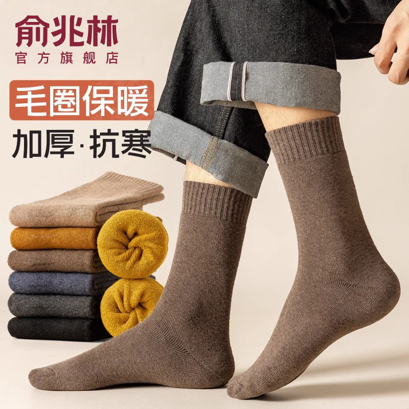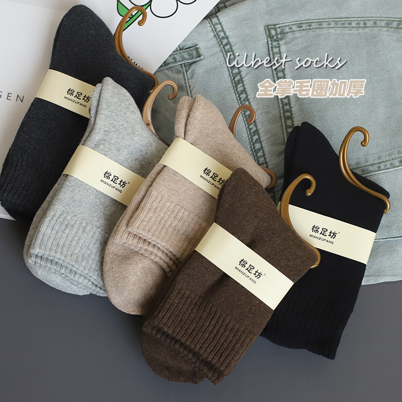 袜子男秋冬纯棉中筒袜简约纯色毛圈加绒加厚保暖学院风毛巾底长袜