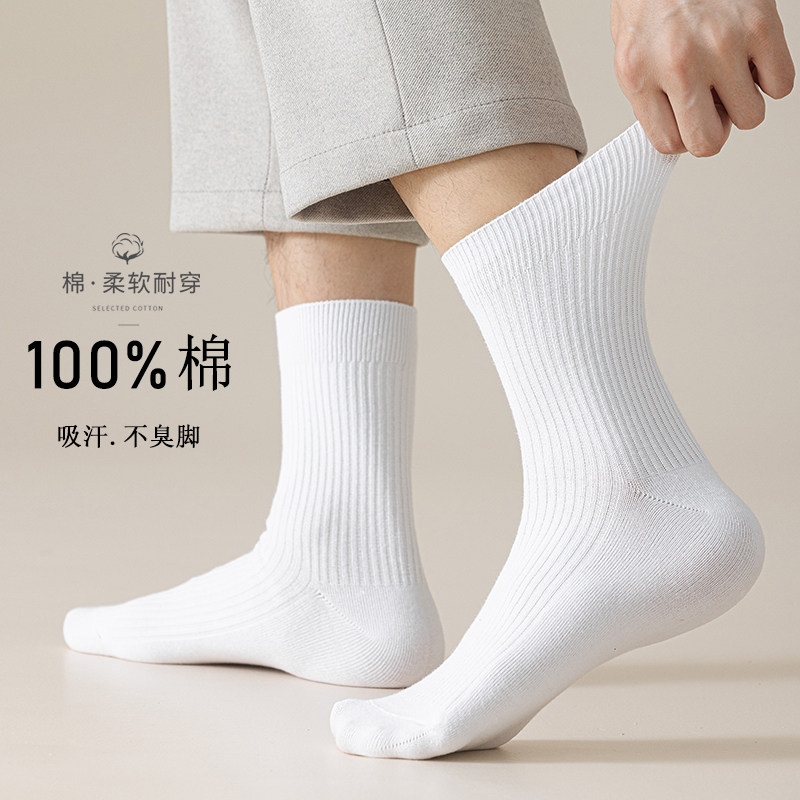 白色袜子男秋冬纯棉中筒袜纯色竖条袜商务袜全棉运动吸汗抗菌长袜