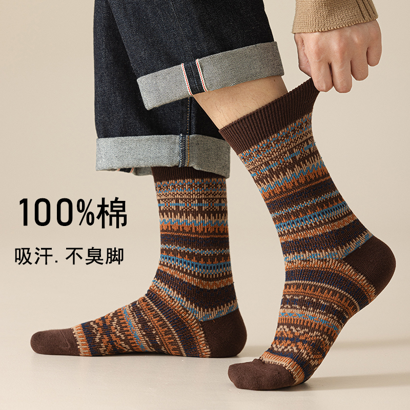 返潮复古花袜子男秋冬纯棉中筒袜双针舒适透气无骨袜英伦风长袜男