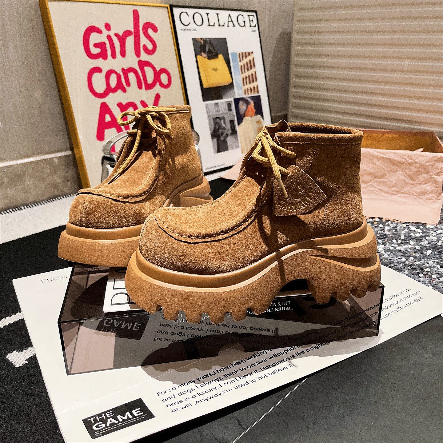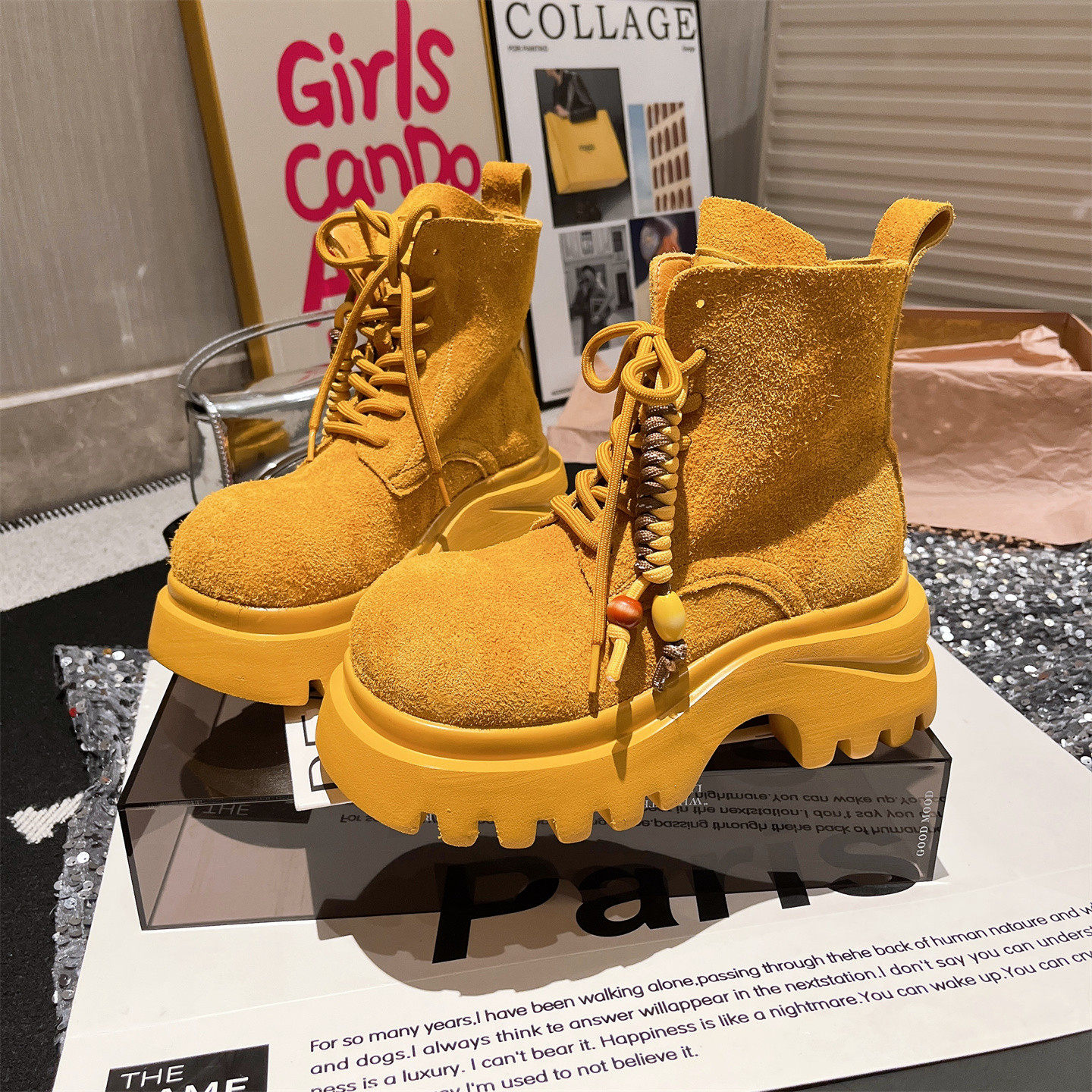 爱米高马丁靴磨砂真皮大头系带厚底松糕工装大黄靴机车靴户外女靴