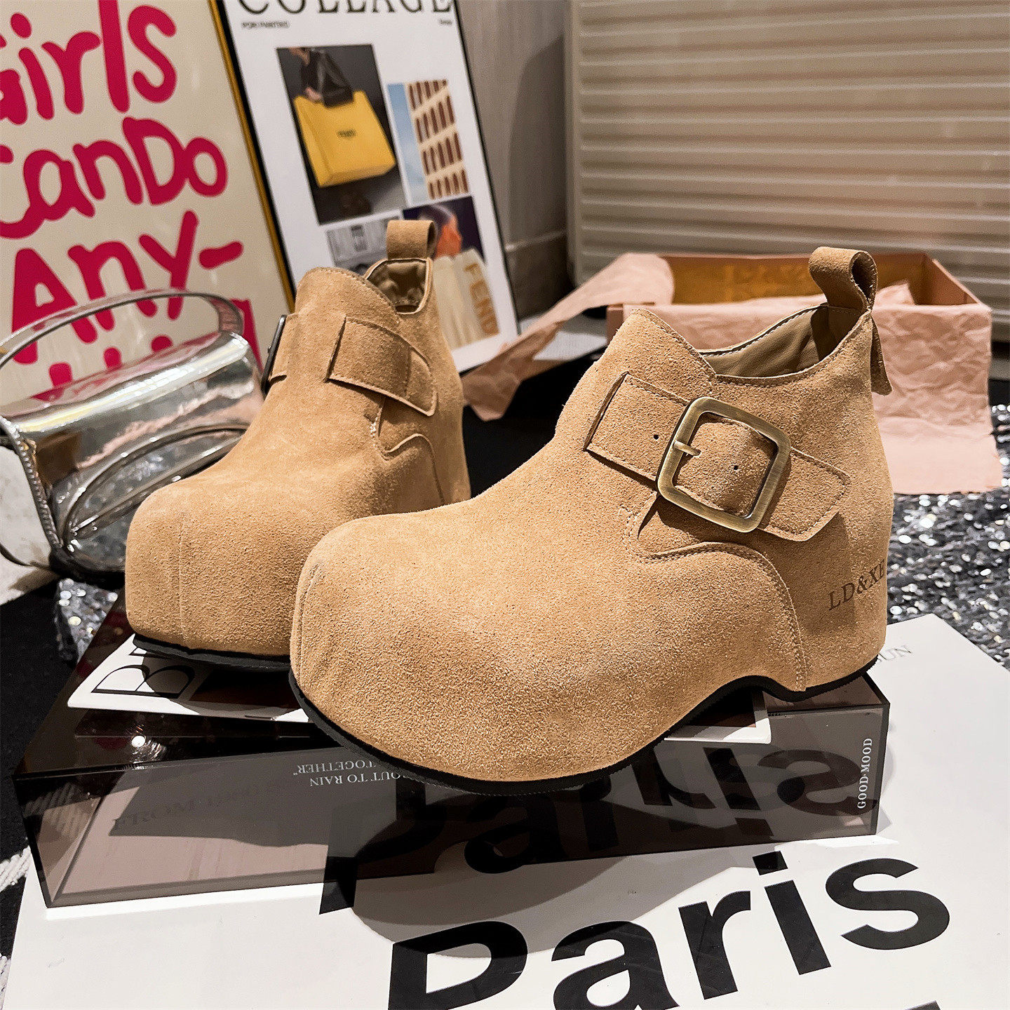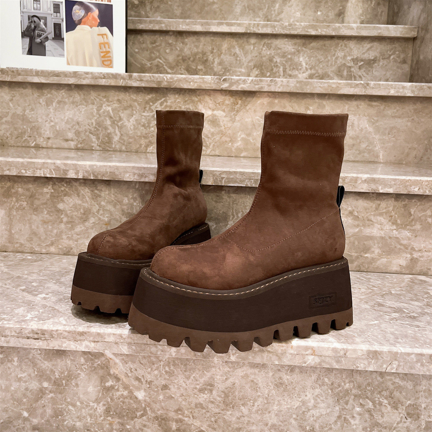 爱米高大头弹力靴厚底松糕瘦瘦靴马丁靴短筒靴小个子8cm可可棕女