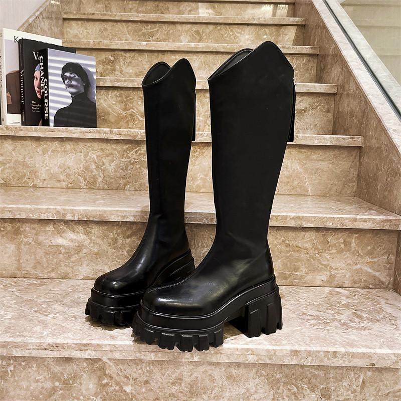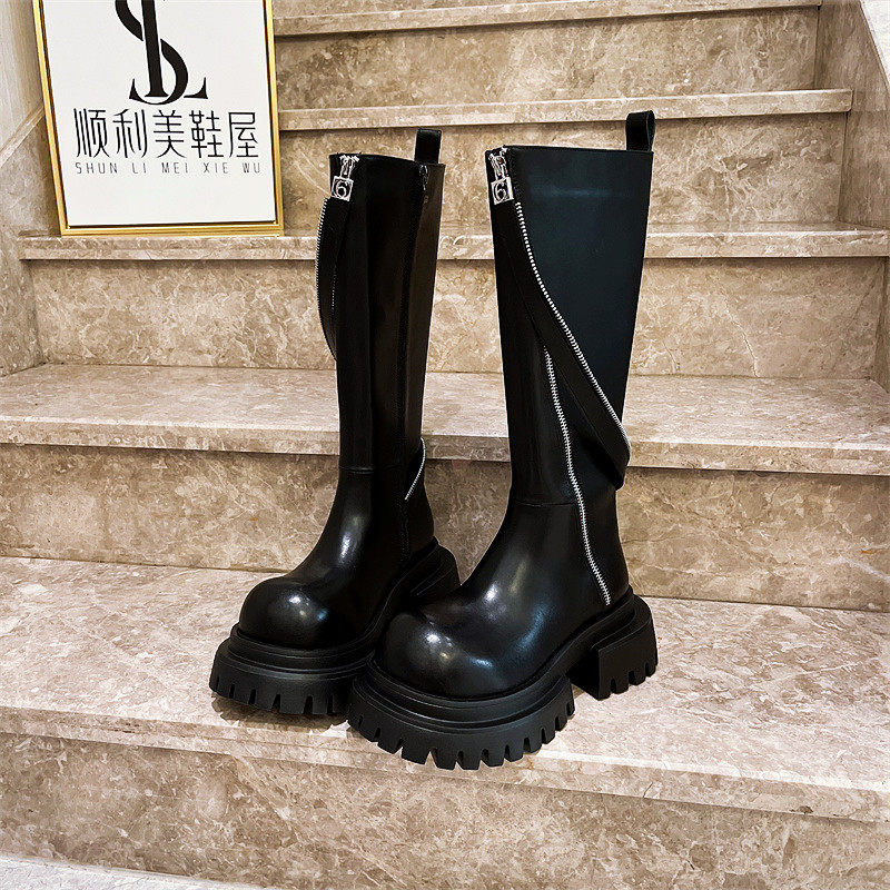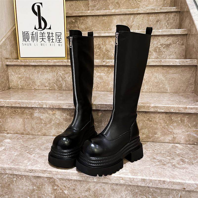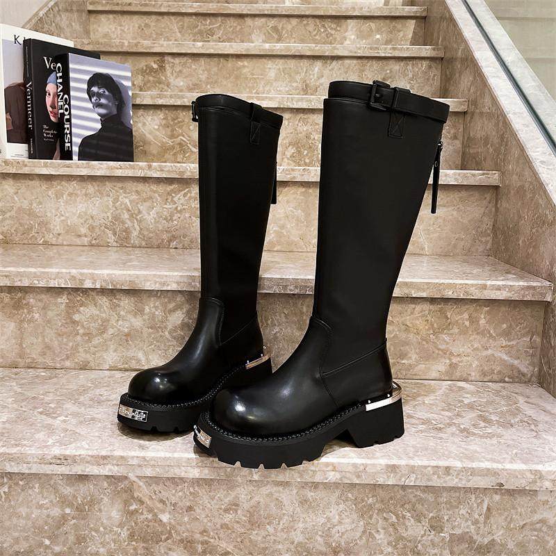 爱米高马丁靴女真皮前拉链三层底走秀款显瘦骑士高筒靴不过膝松糕