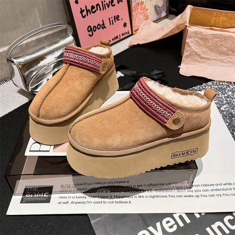 爱米高真皮纯羊毛一体包头松糕厚底拖鞋冬季保暖雪地靴两穿女鞋拖