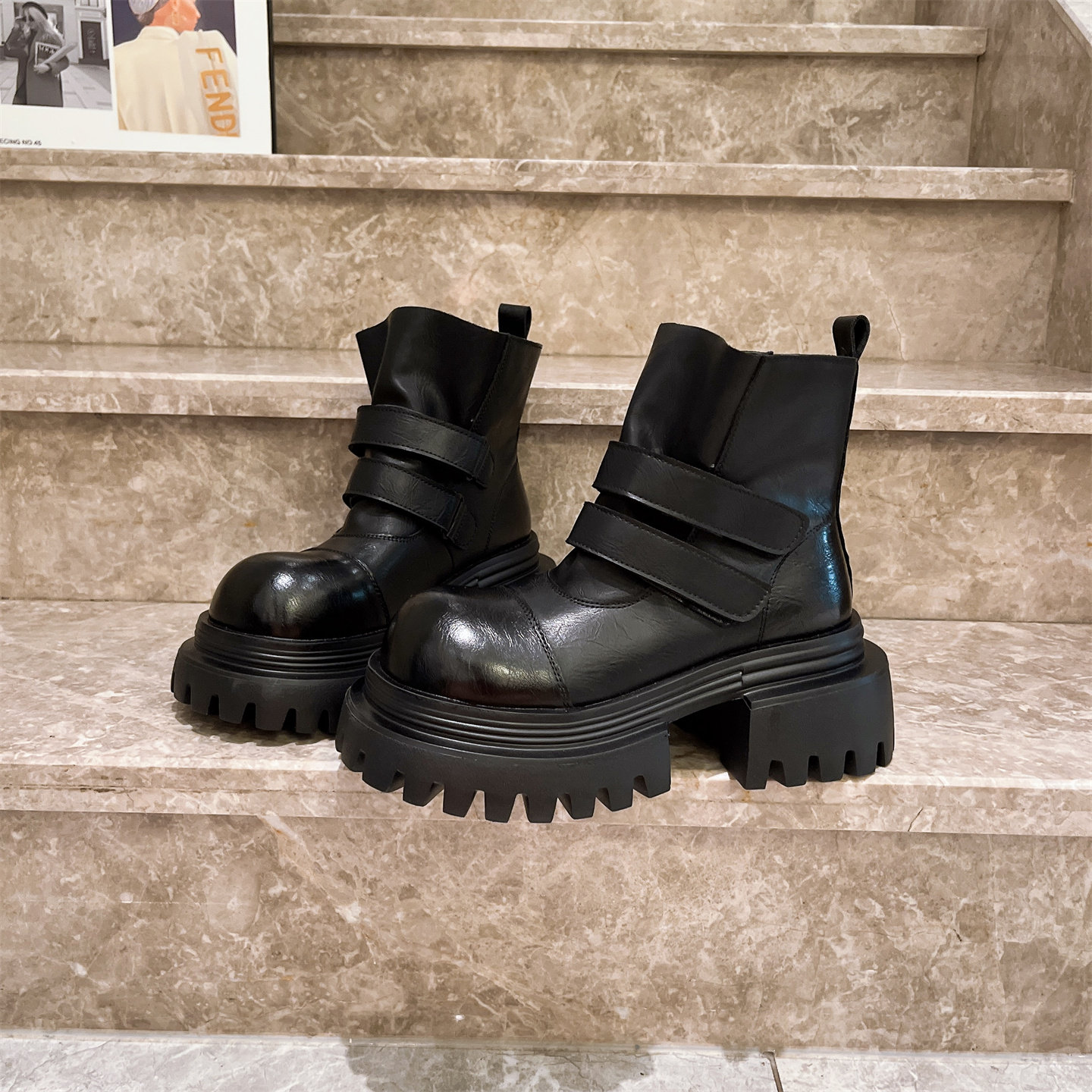 爱米高秋冬真皮短靴魔术贴厚底短筒女靴松糕马丁靴切尔西靴机车靴