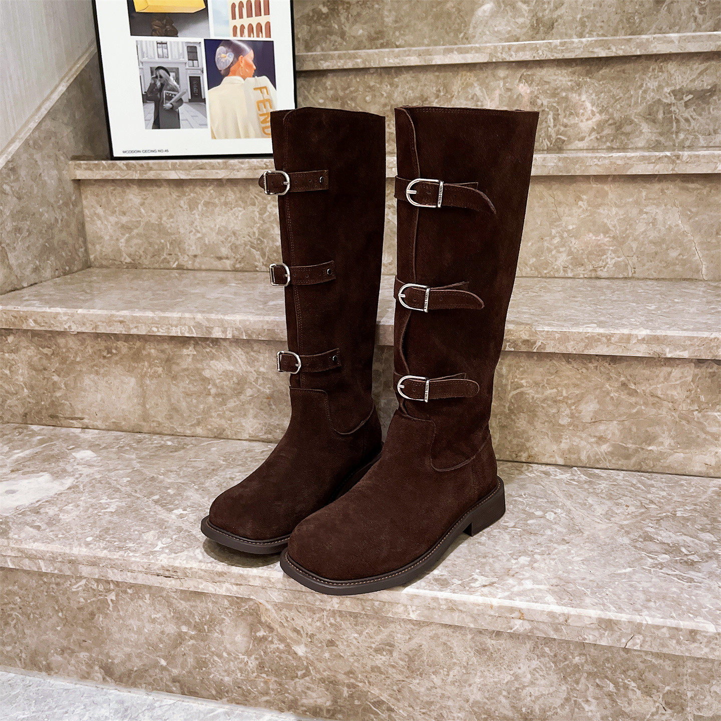 爱米高真皮复古皮带扣粗跟西部靴不过膝骑士靴废土风长筒靴马丁靴