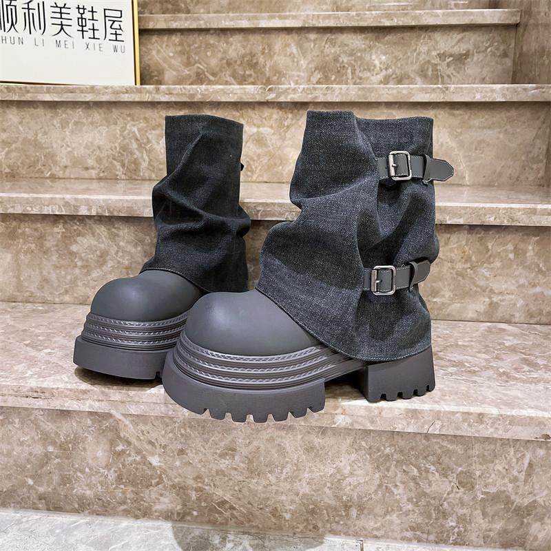 爱米高大头芒果头牛仔堆堆靴裤管靴厚底松糕走秀机车靴短靴马丁靴