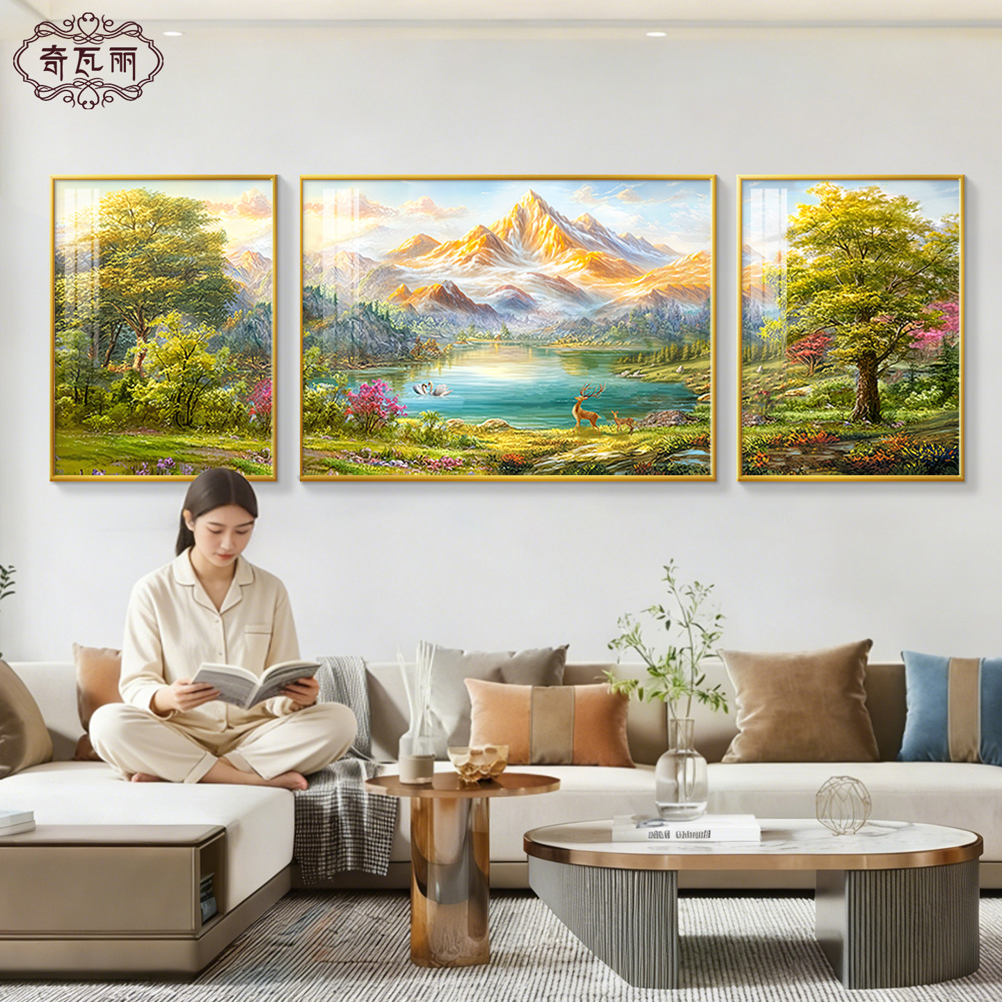 日照金山客厅装饰画山水画油画沙发背景墙挂画2025新款三联画壁画