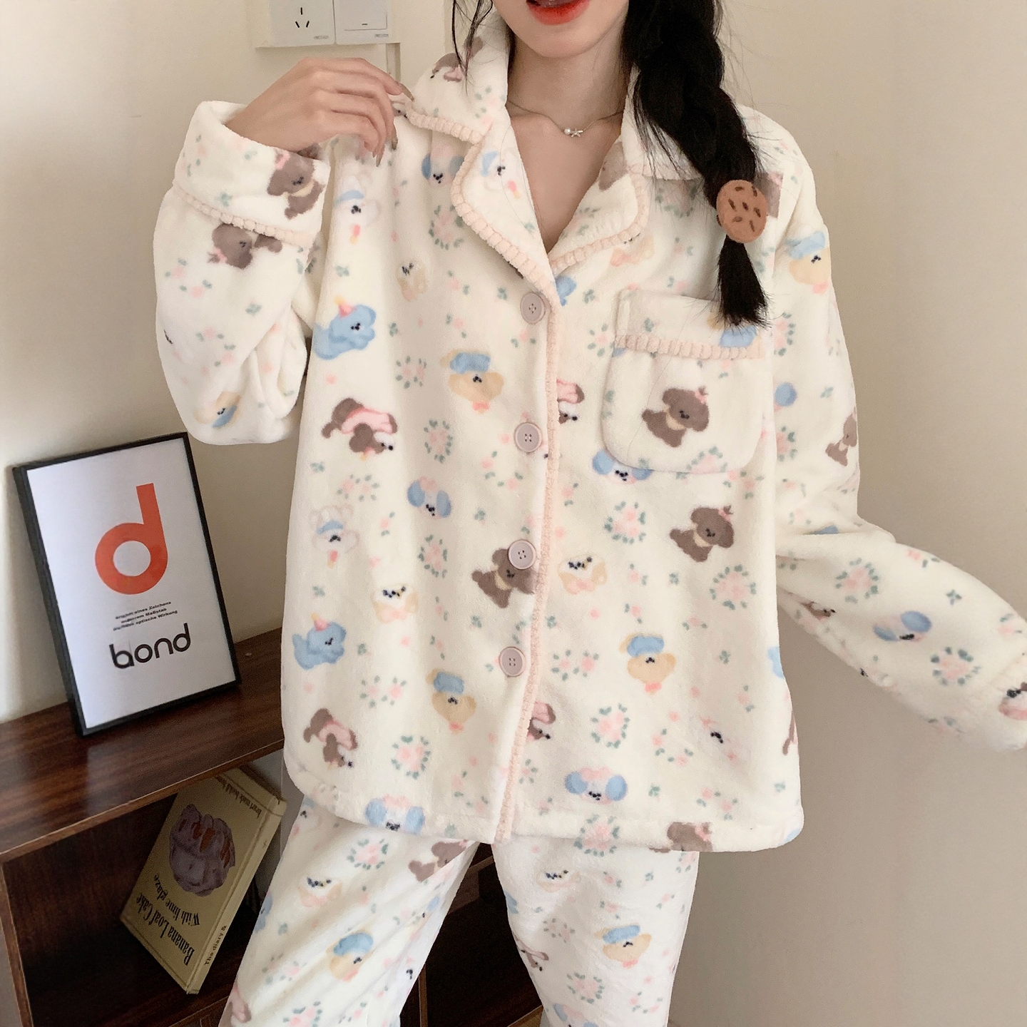 高级感可爱卡通法兰绒睡衣女冬季保暖小翻领开衫珊瑚绒家居服套装