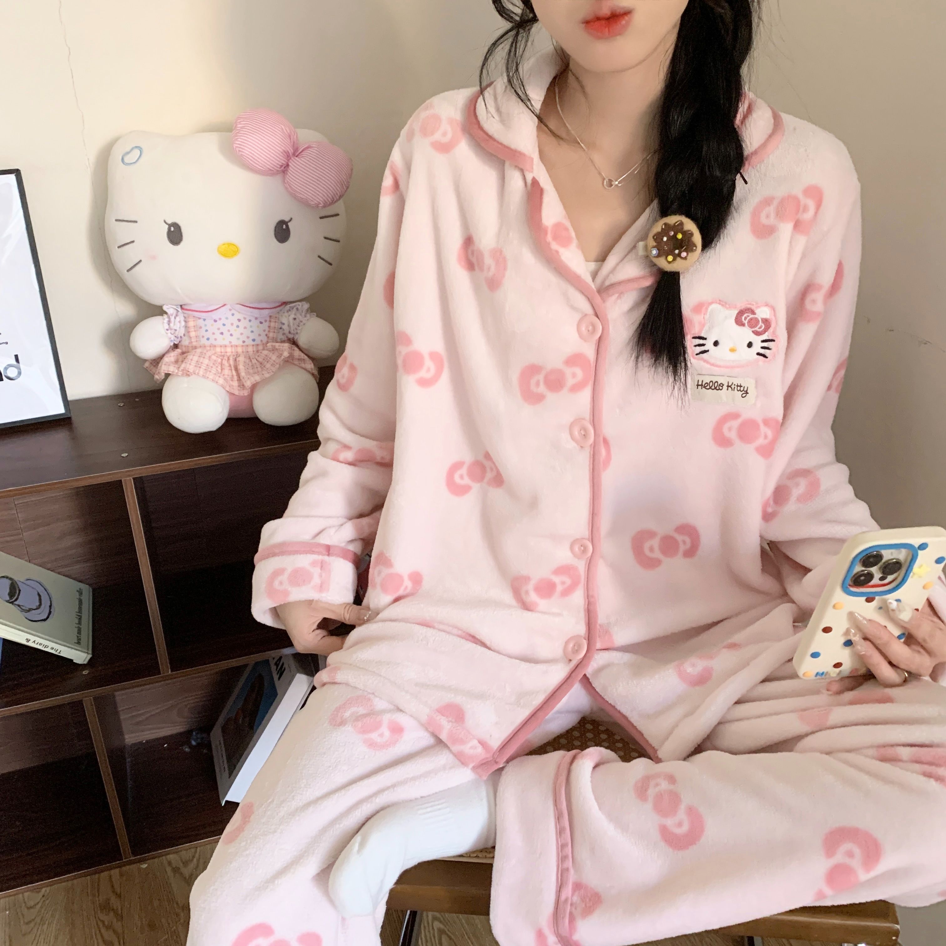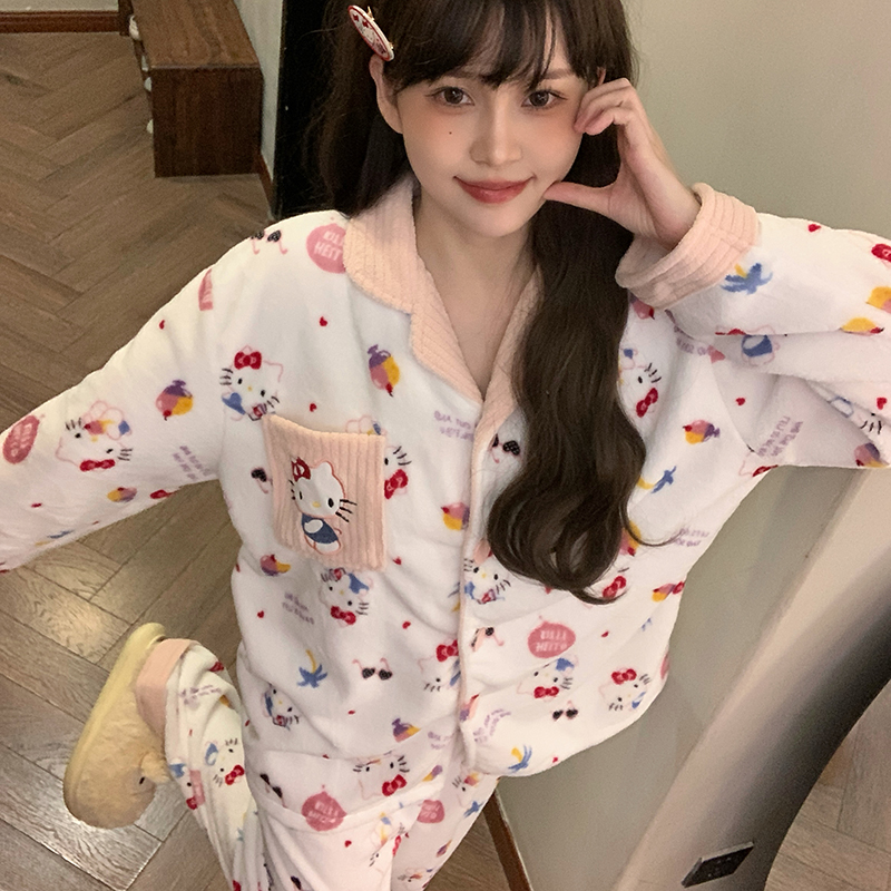 卡通kt猫珊瑚绒睡衣女秋冬款加绒加厚网红风学生大码法兰绒家居服