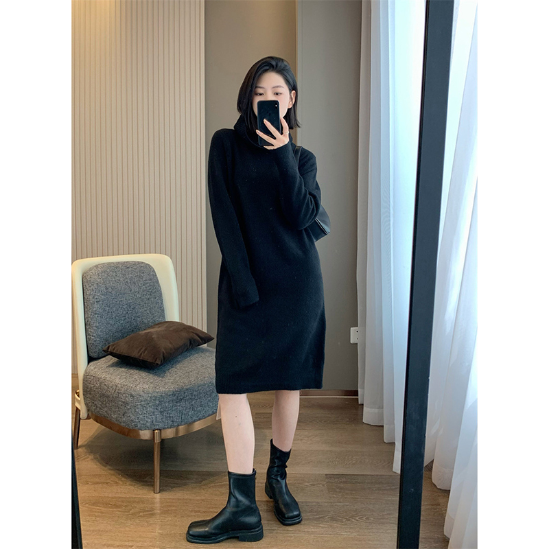 上身效果好的一塌糊涂~羊绒衫女中长款半高领毛衣连衣裙过膝宽松