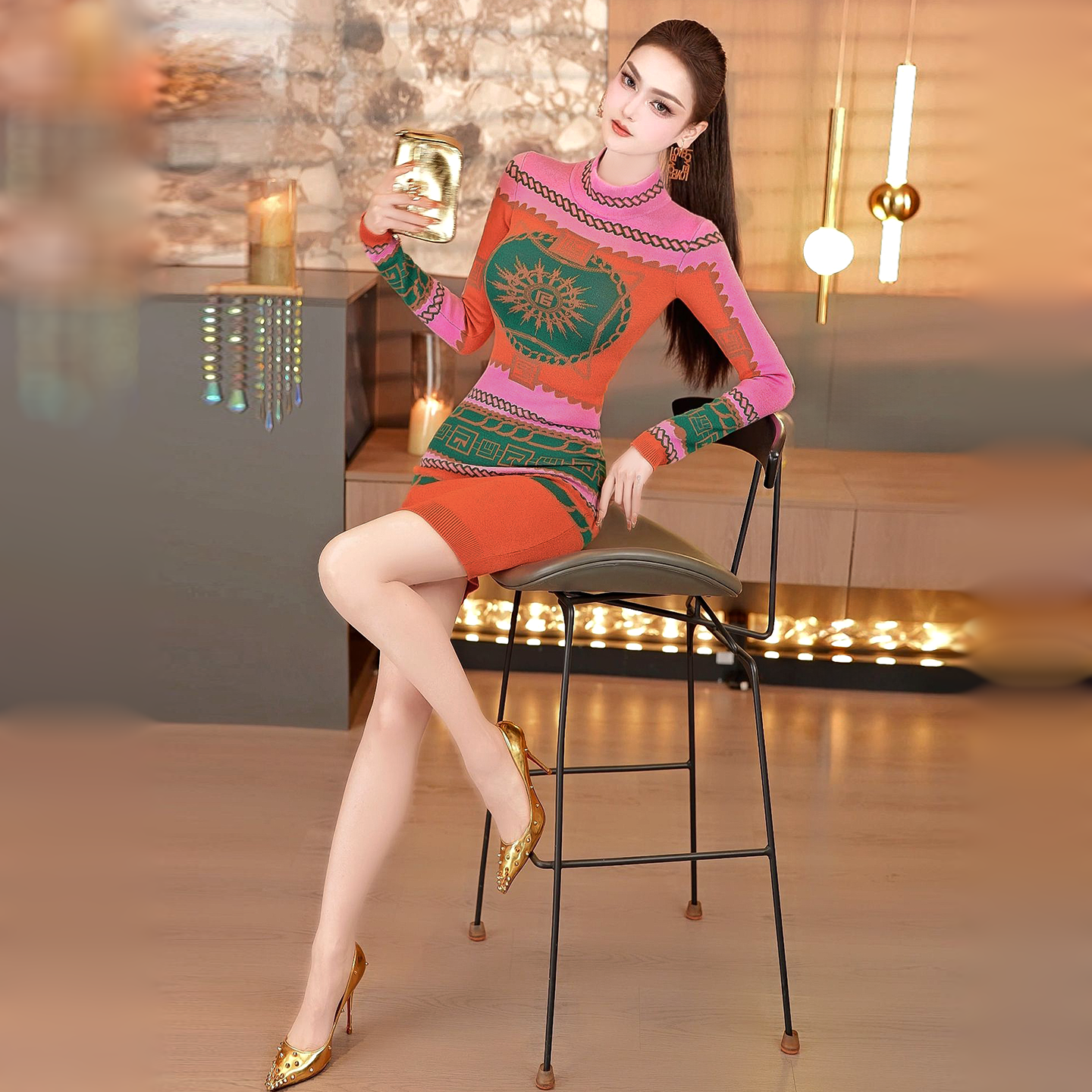 型色缤纷秋季复古印花针织裙2025新款修身减龄半高领毛衣连衣裙