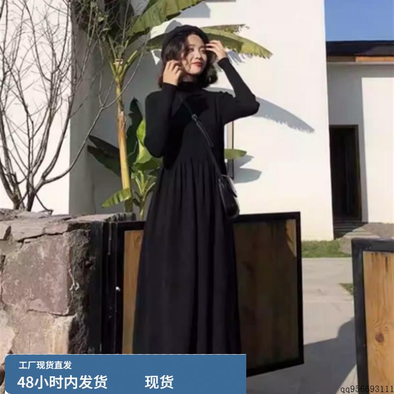 高领毛衣女套头秋冬长袖修身针织连衣裙长款紧身黑色中长款打底衫
