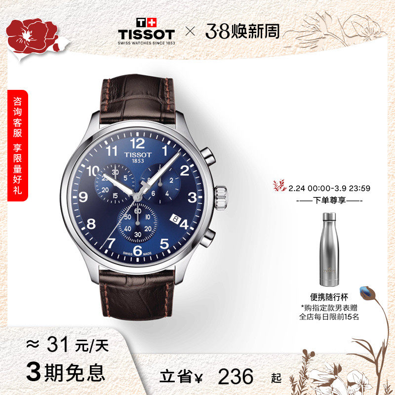【礼物】Tissot天梭速驰系列蓝盘运动防水石英皮带手表男表