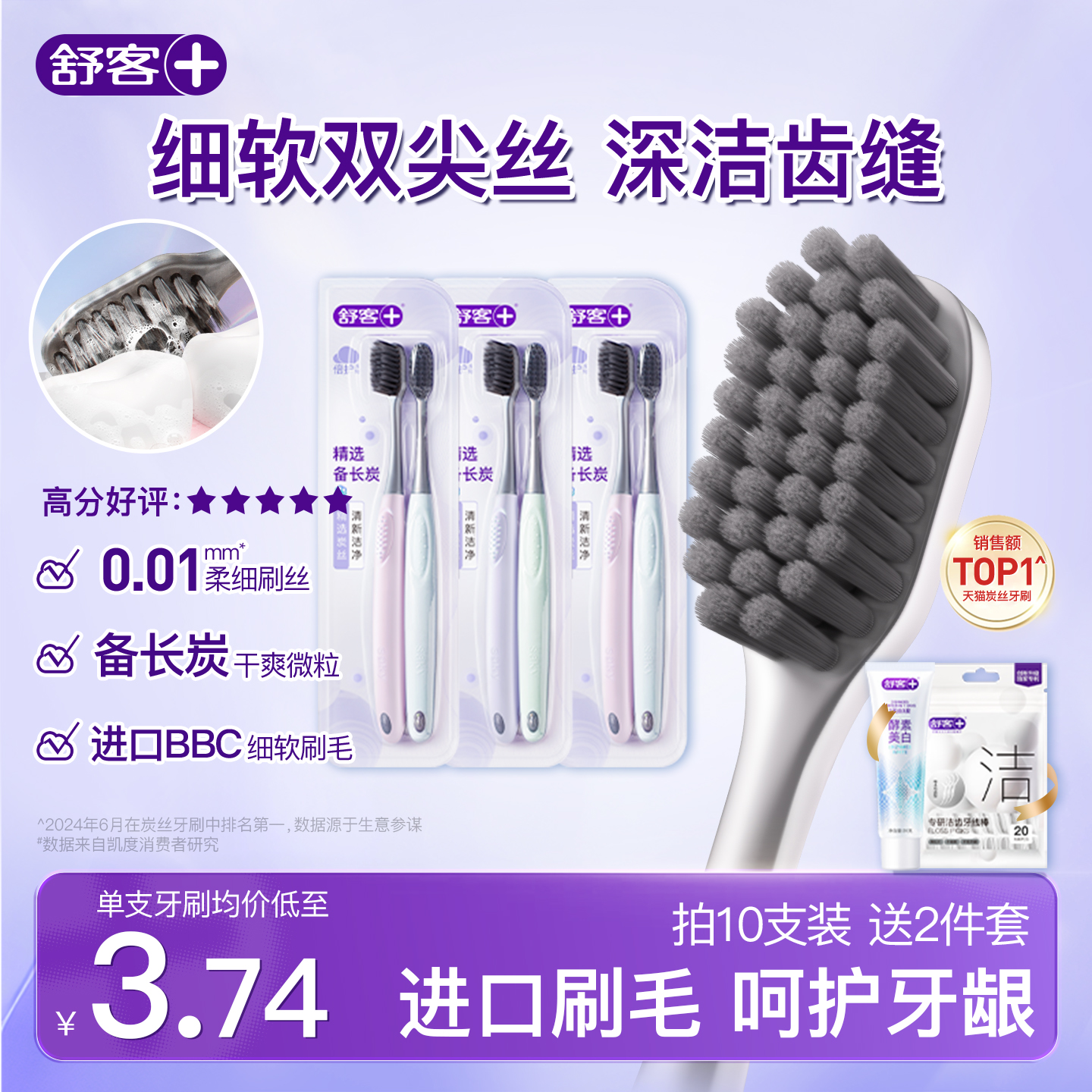 舒客炭丝牙刷软毛护龈小头成人家庭装家用男女官方旗舰店正品牌克