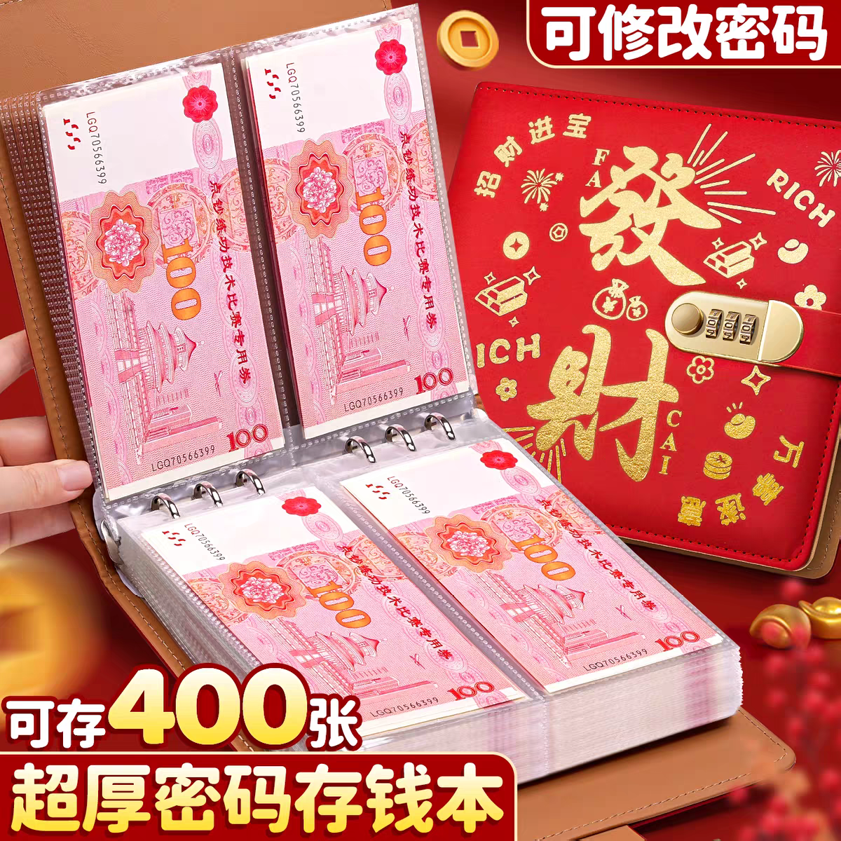 暴富!存钱夹钱册2025年新款密码锁现金存钱本收纳册儿童理财人民币纸币收藏册钞票书2026可放现金装钱笔记本